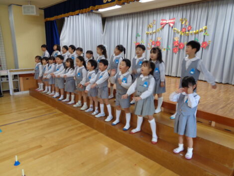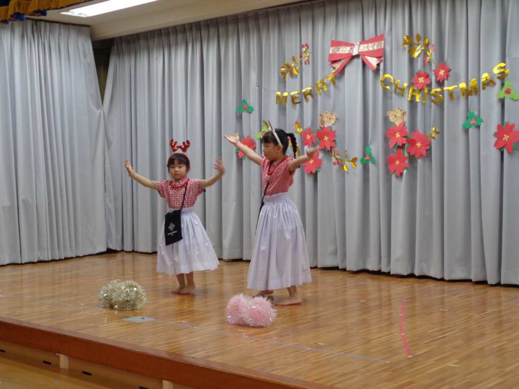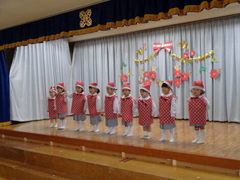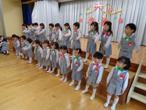 今日はクリスマス会でした。年長さんは英語の歌とハンドベル、2歳児さんはおゆうぎ、年中・年少さんは歌を、またフラダンス部もおどりを披露してくれました。とってもよくできたので、サンタさんが来てくれて、みんなにプレゼントをくれました。いい子にしてたらおうちに行くねと約束して、サンタさんは帰っていきました。