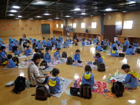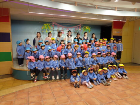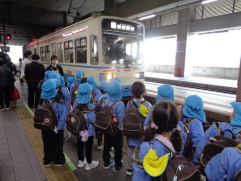 今日は全園児で子どもの館に遠足に行きました。3グループに分かれてボ-ルプール、チャレンジスポーツ、ゲームとおもちゃのコーナーを順に巡り遊びました。午前中思いっきり遊び、弁当を食べておやつを楽しみました。年長さんは社会体験として、穴生駅から黒崎駅まで筑豊電鉄に乗りました。